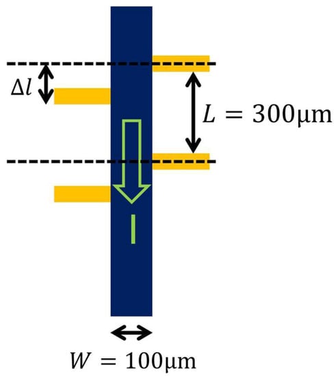 - The observed effect is way too large. In the lithography pattern we used (Figure 1), the width of the Hall bar is W = 100 µm, and the distance between the two neighboring voltage contacts is L = 300 µm. Assuming, conservatively, the upper limit for the misalignment, l = 0.5 µm, this would give and . However, this is much smaller than the experimental value in Figure 2c, where at room temperature, while near Tc it surges to 30%. To produce such a big effect, the contact misalignment would have to be 30 µm, and that would be visible under an optical microscope or even to the naked eye.