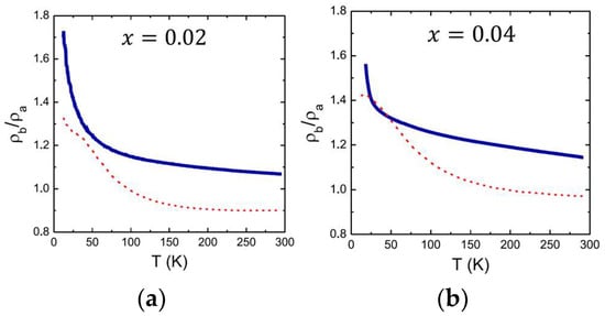 Figure 9. ‘Nematicity’ in LSCO films and bulk crystals. (a) The anisotropy in resistivity, expressed as the ratio . Blue solid curve: our data from a heavily underdoped (x = 0.02) LSCO film. Red dashed line: data measured on bulk LSCO crystal (after Ref. [34]). (b) The same as in (a), but for x = 0.04.