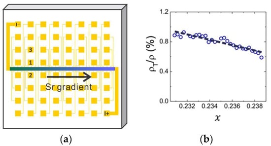 (a) The lithography pattern used to fabricate a COMBE LSCO library. The central Hall bar is aligned along the direction of the Sr doping gradient. One pair of contacts, e.g., {1, 3}, measure at one sector (one “pixel”) of the Hall bar, and 30 pixels in total comprise one library of doping-dependent . Opposed pairs, e.g., {1, 2}, are used to measure the transverse . (b) Open circles: measured using this technique in an LSCO thin film. Black dashed line: a linear fit to the data. The measured ratio is approximately linear in x. Adapted from [1].