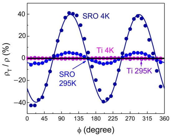 Comparison of SRO, an electronic nematic, with the Ti control sample. In the Ti film, is zero at T = 295 K (purple dots) and T = 4 K (magenta dots). This is in stark contrast to SRO, where is substantial at T = 295 K (light blue dots) and very large at T = 4 K. (dark blue dots). The solid lines are the fits to for experimental data in matching colors. The solid black line stands for . Adapted from [26].