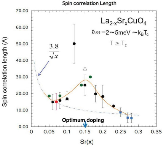 Figure 3. Experimental results by various groups [22,23,24] on the doping dependence of the spin-correlation length in underdoped to overdoped regimes of La2−xSrxCuO4.