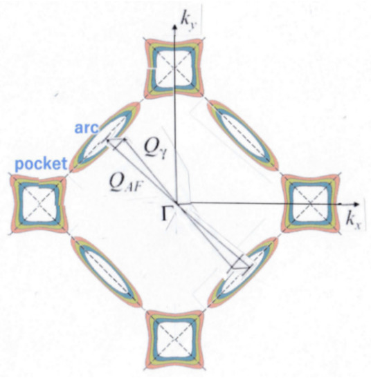 Concerning the coexistence of the Fermi pockets and the Fermi arcs, ARPES experiments have reported only on the existence of Fermi arcs, but not on the Fermi pockets (see Yoshida et al. [30]). Here, we suggest a reason why ARPES is not able to observe Fermi pockets. As shown in Figure 1, the KS particles in the Fermi-pockets occupy | a 1 g MO (mainly Cu dz2 orbital), while the SS particles in the Fermi arcs occupy | b 1 g MO (mainly Cu dx2y2 orbital). Thus, the wavefunction of the KS particle is perpendicular to the CuO2 plane (the crystal surface), while that of the SS particle is parallel to the CuO2 plane. As a result, we can say that, for most of the ARPES experiments in which the electric vector of incident photon is parallel to the CuO2 plane, we can mainly observe the Fermi arcs, even though FS consists of pockets and arcs.