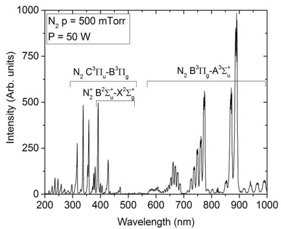 The plasma spectrum recorded at treatment conditions is presented in Figure 1. In the wavelength range between 200 nm and 1000 nm, we identified emission bands of nitrogen molecules: first positive system (transition B3Πg–A3Σ+u), second positive system (transition C3Πu–B3Πg), and nitrogen ions: first negative system (transition B2Σ+u–X2Σ+g) [17,18]. The emission in the region below 285 nm may originate from excited N2 (fifth positive and/or Gaydon–Herman singlet systems) or NO bands formed due to small amounts of oxygen impurities. Lines of atomic nitrogen have not been observed. However, this is due to the fact that dissociative excitation of N2 or electron excitation of N atoms are not favored processes in low-pressure RF plasmas in nitrogen. This results in absence of N lines in the spectrum in this type of discharge generally [19] On the other hand, it has been demonstrated that these types of non-equilibrium plasmas have many advantages when used for plasma functionalization over conventional doping techniques [13].