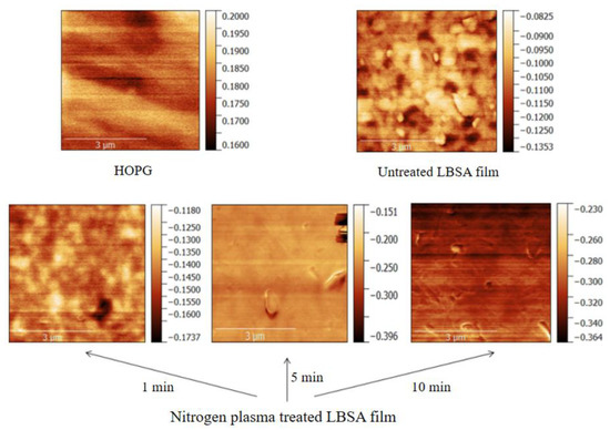 KPFM map of HOPG, untreated, and nitrogen-plasma-treated LBSA film for 1, 5, and 10 min nitrogen plasma exposure time.
