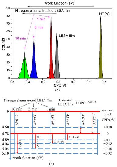 To examine the influence of nitrogen plasma doping on the electronic structure of LBSA films and predict the structural arrangement of nitrogen in doped LBSA films, we measured the surface work function (WF) of LBSA films with KPFM prior to and after nitrogen plasma treatment. Figure 3 depicts KPFM maps of the contact potential difference (CPD) between the sample and the tip before and after nitrogen exposure. Each of the surfaces shown on the different panels of Figure 3 has different CPD, as evidenced from the scale bars.