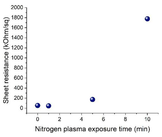 Sheet resistance of LBSA graphene films as a function of nitrogen plasma exposure time.