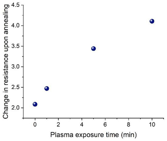 For a further study of the processes occurring on the surface of the films and their stability, we performed vacuum annealing of the LBSA graphene films both before and after N plasma treatment. We have shown previously that untreated, as-made LBSA films undergo a decrease in resistance upon thermal treatment [6], which is also the case in this work. The sheet resistance decreases by a factor of ~2 upon annealing of pristine LBSA films. However, the films that are exposed to N plasma prior to annealing undergo a larger change in resistance upon annealing, as depicted in Figure 8. In fact, the longer a film is treated with plasma, the more its resistance changes during annealing. This effect is an indication that the described plasma treatment and doping of LBSA films is reversible with treatment, which can be useful for construction of practical sensor devices [23]. Plasma treatment reversibility with annealing is not surprising and has been observed in numerous studies before [24].