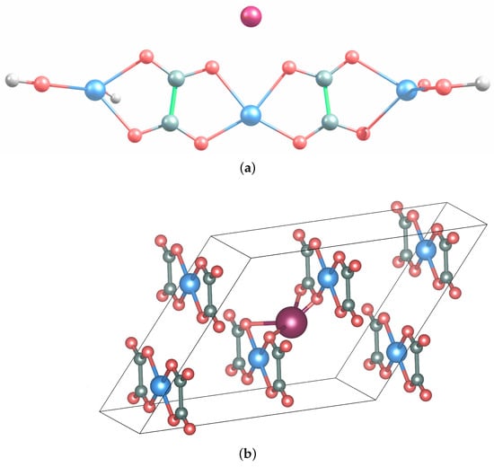 Metal oxalates can support similar conversion mechanisms. As an example, we consider the ferrous oxalate dihydrate (FOD) or the iron (II) oxalate dihydrate (FeC2O4·2H2O) (humboldtine). This material is promising for clean energy applications, and can also be mined or easily synthesized [18]. Its high photocatalytic activity [19,20] and proton conductivity [21] justifies its use in photocatalysis and wastewater treatment [22,23]. Moreover, due to its relatively low thermal stability [24], it is used as a precursor to synthesize various Fe-containing battery materials [25,26]. FOD has also shown promising properties for Li storage and LIB anode applications [27,28,29]. An outstanding feature of FOD is that its hydration level has a direct impact on its anodic activity in LIBs. In an earlier computational study [29], we showed that anhydrous ferrous oxalate (AFO) (FeC2O4) supports a higher Li storage capacity and a lower voltage compared to its fully hydrated state (FOD), and even its partially hydrated counterpart, in accordance with experimental studies [13,27]. The negative impact of structural water on FOD’s electrochemical activity is a direct outcome of Li hydration by the water molecules and their inhibitory role in Li interaction with the iron oxalate chains [29]. It is also related to the interaction of structural water with LiPF6 and HF production [13]. Therefore, AFO offers higher stability and more favorable electrochemical potential relative to FOD [13,29].