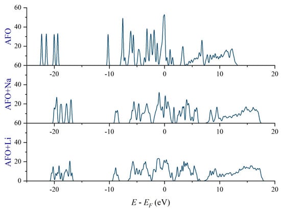 DOS profiles of pristine AFO and Na/Li doped AFO. The DOS profile of pristine AFO is already slightly metallic within the PBE approximation, and it becomes more metallic with both Li and Na addition.