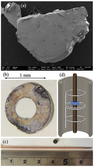 In the experiment, a ring-shaped SC cut out of a single crystal is used, shown in Figure 1a, with a femtosecond laser. The ring is presented in panel (b). Since FST is brittle, the ring is not perfect. However, as we argue below (in Section 4.1), the smallest outer radius and height count for our analysis. The ring is pierced by a long excitation coil (EC). These parts are shown in panel (c). The excitation coil, ring, and second-order gradiometer are surrounded by a main coil, as in panel (d). The main coil is used to zero the field to less than 0.1 T on the ring, and for field-dependent measurement. Details of the dimensions of the different parts are given in the figure’s caption. EC current generates a vector potential on the ring, nominally without a magnetic field H. This vector potential is responsible for persistent rotational current in the superconducting ring. This rotational current produces its own vector potential and a magnetic moment. The vector potential in Equation (1) is . The sample’s magnetic moment m is detected by vibrating the ring with the EC rigidly relative to the gradiometer. This mode is called vibrating sample magnetometer (VSM) mode. It utilizes a lock-in amplifier to measure the SQUID output voltage at twice the vibration frequency. This output is proportional to the magnetic flux of a sample through the gradiometer, namely, the vector potential of the sample. It could also be represented by the magnetic moment of the sample.