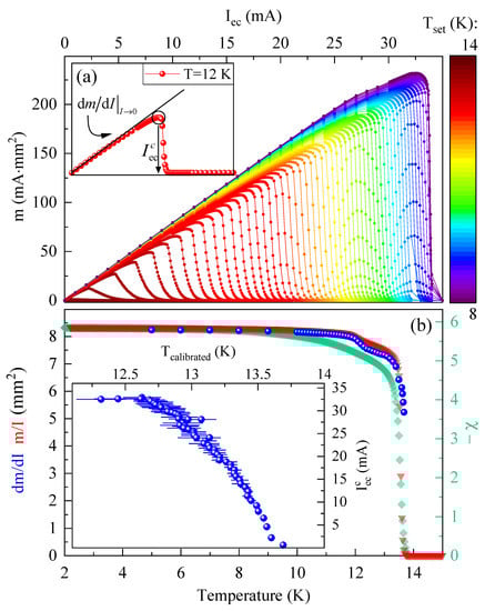 Data: (a) Stiffness measurements. SC’s magnetic moment vs. the current in the excitation coil at different temperatures, indicated by the colors. The inset is focused on the measurement at 12 K. A linear relation is found for low currents. At some critical current value, the signal drops to zero. The blue circles in (b) depict the temperature dependence of the linear slope obtained at low currents (far from ) in panel (a). (b) Critical temperature. SC’s current in the EC vs. the temperature (red down-pointing triangles), as described in Section 3.1; measured susceptibility (with a minus sign) vs. the temperature (emerald diamonds) in MKS units in the presence of a magnetic field of mT and without an excitation coil (according to Section 3.2). Inset (b) shows the critical currents vs. the calibrated temperature (extracted from the breakpoints in panel (a)).