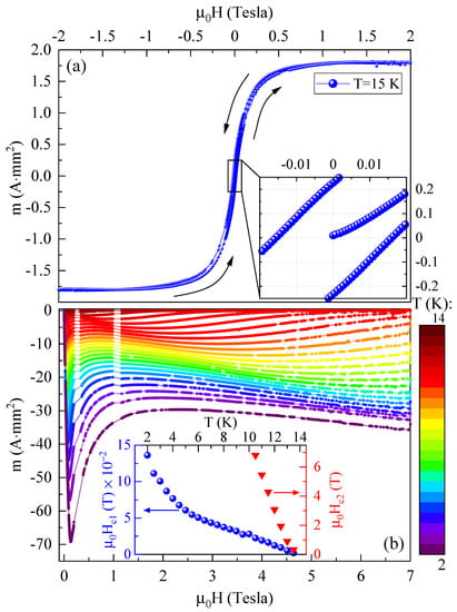 The response of the superconducting ring to an applied magnetic field at different temperatures below is reflected in Figure 3b. From that measurement, we extract the first and second critical fields, and . is defined by the maximum magnitude of the moment for each temperature. A second peak emerges at an intermediate field between and , and is attributed to the role of twin boundaries []. In principle, is defined by the value of H, for which []. However, it is not easy to determine because of the asymptotic behavior of the moment. Therefore, we chose a criterion by which is the field at which the moment is 10% of the second peak magnitude. Below a temperature of 10 K, becomes higher than the maximum field available to us. and as a function of temperature are shown in the inset of panel (b).