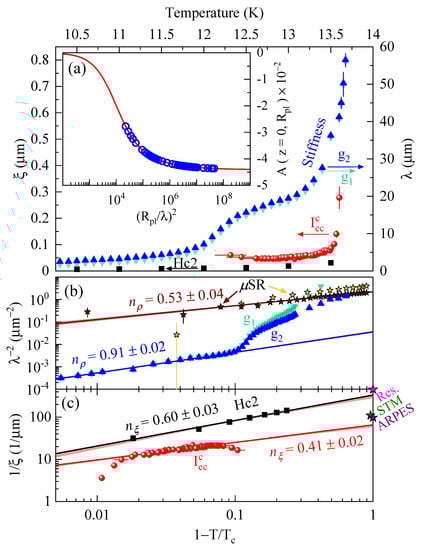 Penetration depth and coherence length. (a) The right Y-axis shows the penetration depth as a function of the temperature in blue and emerald triangles, for the different calibration methods. The left Y-axis shows the temperature dependence of the coherence length. The red-circles are taken from the critical current measurement in Figure 2b-inset through Equation (14) with the measured , and the black-squares are from the second critical field in Figure 3b-inset with Equation (17). Panels (b,c) are log-log plots of the stiffness and vs. , respectively. The linear regression represents the critical exponents according to Equations (15) and (16), respectively. Earlier stiffness measurements using the SR method have been added to (b) in brown [] and yellow [] stars. The same power law is fitted to this data. For comparison, we add to (c) asterisks reflecting the measurements of from the resistivity method [] in magenta, ARPES [] in purple, and STM [] in green.