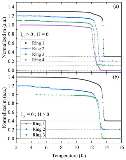 To examine reproducibility, we investigated more than one ring cut from different crystals of FST. A comparison between different rings from other crystals appears in Figure 5. The figure shows the normalized, and shifted (for clarity), SC moments as a function of the temperature in two cases: panel (a) with a current in the EC and zero-applied field and panel (b) with an applied field and no EC current. The applied currents and fields are in the range mA and mT, respectively, but not necessarily equal for different rings. The main ring of this research is 1. The knee temperature and sharpness vary from ring to ring (Figure 5a). Interestingly, multiple knees appear in the standard, in-field measurement of ring 2 in panel (b).