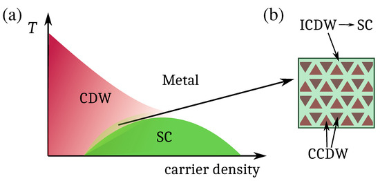 In some transition metal dichalcogenides, the competition with an incommensurate charge-density wave may be weak, possibly allowing for a phase with both order parameters different from zero. The case of strong competition, in the presence of disorder, may instead be relevant for cuprates [95,101], in which a very fragile superconducting state was suggested to be responsible for an avoided quantum critical point and the peculiar behavior of the magnetoresistance curves (see Figure 4).