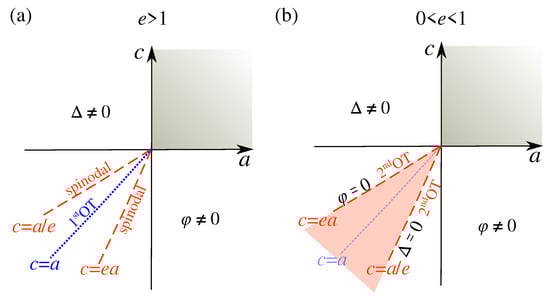 Conversely, when , we find that in the whole region of parameter space, where the mixed solution with both nonzero order parameters exists. In this latter case, the mixed phase joins continuously the pure phase with and along the half-line in the third quadrant of the c vs. a plane, and the pure phase with and along the half-line in the third quadrant of the c vs. a plane (see Figure 3a). Thus, for positive but sufficiently small e, the competition between the two phases is not strong, and the first-order phase transition between the pure phases characterized by either of the two competing orders is circumvented by the occurrence of a mixed phase where both and are nonzero.