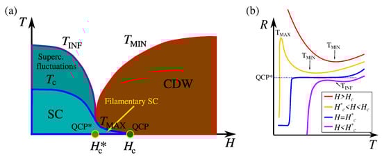 Let us now discuss the phase diagram proposed for cuprates in Ref. [95], taking the various characteristic temperature scales appearing in the resistance vs. temperature curves measured in LSCO at various magnetic fields (see Figure 4) as proxies of the various phases. At high magnetic fields, the resistance curves are characterized by a minimum at a temperature that decreases with decreasing H (red and yellow curves in panel b show the corresponding resistances). This temperature scale was proposed to be the proxy of charge-density-wave ordering. At zero or low magnetic field, the resistance curves decrease monotonically with decreasing the temperature. We take the temperature of the inflection point as the proxy for the onset of superconducting fluctuations, which decreases with increasing H and signals the precursor of superconductivity (see also the purple curve in panel b). The two curves and meet, with a vertical tangent, at a magnetic field that marks at zero temperature the quantum critical point QCP for the magnetic-field-driven transition between superconductivity and charge-density wave. The corresponding resistance, plotted in blue, shows in fact a horizontal tangent signaling the (avoided) quantum critical point, and then, it drops to zero at some lower temperature . According to the scenario discussed in Section 3, cuprates appear to be in a regime of strong competition between the two phases (), and the transition is of first order. The first-order transition line is very steep (nearly vertical) in the temperature vs. magnetic field plane (see Figure 4).