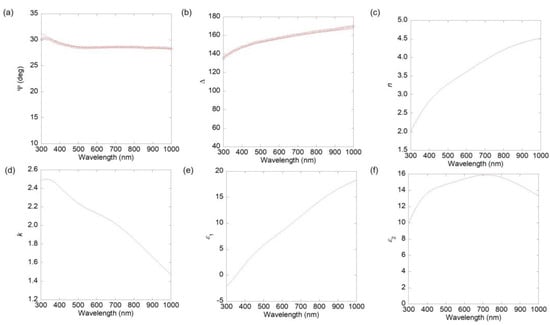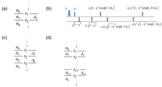 - The materials 1, 2, …, k with refractive indices of n1, n2, …, nk, respectively. On top of material 1, we assume the presence of air (vacuum) with an index denoted as n0. The reflection of the interfaces 0–1, 1–2, …, (k − 1) –k is represented by r1, r2, and rk, respectively. The phase shifts in material 1, 2, …, k − 1 are represented by Δ1, Δ2, …, Δk−1, respectively. The schematic configuration is shown in Figure 1d. We can detemine the following values: rj = (nj−1 − nj)/(nj−1 + nj), Δj = 4πnjdj,/λ. The total reflection can be represented as Rk = ||2 where
