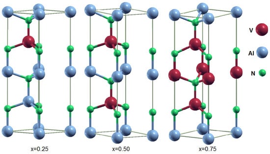 To investigate the ternary alloys, first-principles calculations based on density functional theory (DFT) were carried out. The alloys were modeled using ordered structures that are represented by periodically repeated cells. Figure 1 illustrates the crystal structures of the considered compositions in this study. For the V compositions with , and , the resulting wurtzite cells exhibited two distinct values for the internal parameter, u. Each value corresponds to the separation, in units of c, between the nearest neighbors of Al and N (V and N). The optimization of u was performed solely for the binary compounds AlN and VN in the wurtzite phase, and these optimized values were subsequently utilized for the other concentrations. To determine the total energy, the vanadium concentrations in the ternary alloy were varied across , and 1. The Kohn–Sham equations were solved using the highly accurate full-potential linearized augmented-plane-wave plus local orbitals (FP-LAPW+lo) method, implemented in WIEN2K numerical code [37]. This approach allows for precise calculations of the electronic structure and total energy.