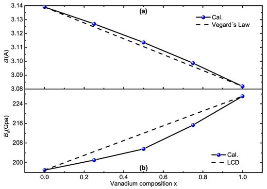 Figure 2a illustrates a decrease in the lattice constant as the vanadium composition increases. The calculated lattice constants of the alloys at various vanadium compositions exhibit a slightly nonlinear dependence on the concentration of vanadium, denoted by x. The variation in the equilibrium lattice constant, as calculated, deviates from Vegard’s law [46], showing an upward bowing parameter of approximately −0.01226 Å. This deviation can be attributed to the subtle differences in the lattice constants of the binary compounds. Such a small negative deviation from Vegard’s law is commonly observed in this type of compounds and aligns with the compositional variation of lattice parameters observed in conventional III-V group alloys. Recent theoretical investigations [47] have also indicated the invalidity of Vegard’s law for III-V nitrides. In Figure 2b, the bulk modulus behavior as a function of vanadium composition in the alloy is depicted, along with a comparison to the linear composition dependence (LCD). The calculated bulk modulus increases with higher vanadium concentrations, indicating reduced compressibility as vanadium content increases. A minor deviation from the LCD can be observed, characterized by a downward bowing parameter of approximately .
