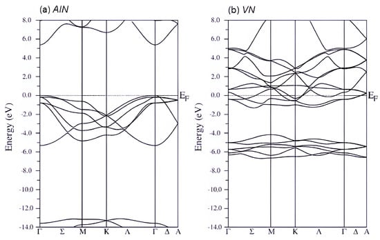 Band structure for (a) AlN and (b) VN in a wurtzite configuration, at the ground state. The valence-band maximum is the zero energy level.