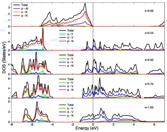 To study the electronic structure of alloys in the wurtzite phase, the band structure and the density of states (DOSs) in the equilibrium volume were calculated using the TB-mBJ potential. Our mBJ results confirm that AlN is a direct band gap semiconductor with energy of 5.385 eV, which is in agreement with the GW and mBJ results reported by other authors. Vanadium nitride shows a metallic behavior, as shown in Figure 3. For intermediate concentrations, , , and , all structures exhibit a metallic behavior. This indicates that the vanadium atoms originate a metallization of the alloys, which is important from an experimental point of view. To obtain a deeper insight into the electronic structure, the total and partial densities of states (TDOS and PDOS) for alloys in the wurtzite phase were also calculated. Figure 4 shows the calculated TDOS and PDOS for wurtzite alloys.