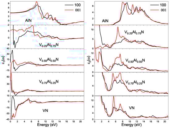 This is the first critical point of the dielectric function, which corresponds to the splitting of wurtzite AlN, as shown in Figure 3, and gives the threshold for direct optical transitions between the highest valence and the lowest conduction bands, also known as fundamental absorption edge. Beyond these points, the curve increases rapidly, which is due to the fact that the number of points contributing towards increases abruptly. When the energy increases, the absorptive part of the dielectric function exhibits two major peaks located at about 9.25 and 11.9 for , as well as 8 and 10.8 eV for , of the wurtzite AlN. Thus, the first spectral peak shows electron transitions from valence band maximum to conduction band minimum. The first peak is dominated by transition mainly from N-p states in the highest valence band to Al-p states in the lowest conduction band, while the second peak corresponds to the transitions of N-p electrons into Al-s conduction bands. Some weak peaks can be observed between these two peaks that are related to weak resonances in the structure. For the concentration , exhibits a relevant peak at 7.7 eV and an energy threshold at 0.5 eV, while a rapid increase occurs at 2.5 eV for due to anisotropy effects. For the concentrations , , and 1, the curves show some outstanding peaks in an energy range of 5 to 9 eV, exhibiting greater intensity in the curve. In addition, a rapid increase occurs at 4 eV for both curves, and small values of the imaginary dielectric function are presented above 15 eV. This behavior is related to the intraband transitions in the valence band, which can realize the N-p and V-d electrons mainly, as observed in the density of states. Some weak peaks can be observed in the higher energies, which are related to weak resonances in the structure. The curve shows a minimum energy of 15 eV for AlN. The real part value in the zero energy limit is 3.85 eV. For , the real dielectric function is very different from each direction, indicating a high degree of anisotropy. At the other concentrations, a less drastic difference can be observed, and the curves have a minimum (maximum) below 2 eV (1 eV).