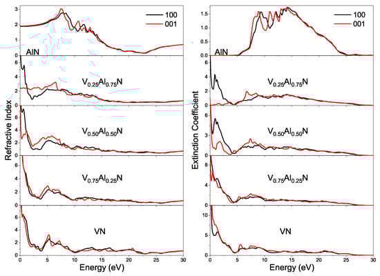 The calculated refractive index along xx- and yy-direction are shown on left side in Figure 6. A slight variation in the refractive index as a function of the direction can be observed for concentrations , , and 1. At compositions and , the refractive index shows a considerable difference as a function of the direction at low energies. The static refractive index in the zero frequency limit is about 1.93, 13, and 12.8 for 0, 0.75, and 1, respectively. For , the refractive index at zero frequency is about 2.44 and 7 in the (001) and (100) directions, respectively. For , at zero frequency, the refractive index value is about 5.2 and 8 in the (001) and (100) directions, respectively. The refractive index presents a maximum value of 3.07 at 7.58 eV for AlN; while for the remaining concentrations, the maximum value of the refractive index occurs in very small energies except for the direction (100) at , the value of which is 3.25 at 6.51 eV. The extinction coefficient is plotted on the right side in Figure 6. Since the extinction coefficient is the imaginary part of the refractive index, they exhibit a similar behavior as a function of the direction. They also present a very similar behavior in the shape of the curves at concentrations x = 0.25, 0.5, 0.75, and 1. However, the AlN has no extinction coefficient below 4.85 eV.