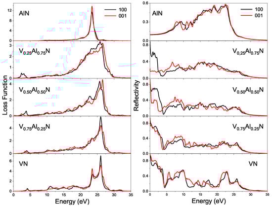 The electron energy loss function is an important factor describing the energy loss of a fast electron traversing in a material. The peaks that can be seen in the loss function spectra are related to the resonance frequency called plasma oscillation frequency. The energy loss can be obtained in terms of dielectric function. The loss function curves of alloys are plotted in Figure 7 (left side). It can be seen from Figure 7 (left side) that the height of the peaks is dependent on the direction. For AlN, the loss function peaks are located at 23.39 eV; however, the peak value along (001) is higher than that of (100). Thus, the characteristic of plasma oscillation along (001) is better than that of (100) for AlN. The alloys show a peak value higher along (100) than in the direction (001), located in 25.76 and 26.60 eV, respectively. For , the maximum value of loss function is found along (001); and the peaks are located at 26.62 and 25.61 eV along (001) and (100), respectively. For , the best plasma oscillation behavior is along (100) with a maximum value at 25.95 eV. In the VN compound, a behavior similar to that of the concentration is presented. In Figure 7 (right side), the reflectivity spectra of the alloys as a function of the energy are shown. The maximum value for AlN is located at 25.55 eV along (001) and shifts to 0 eV for VN due to the intraband decrease in the valence band. The spectrum has a similar trend in shift with an increase in V-concentration. For high energy values, the reflectivity reaches a very small stable value.
