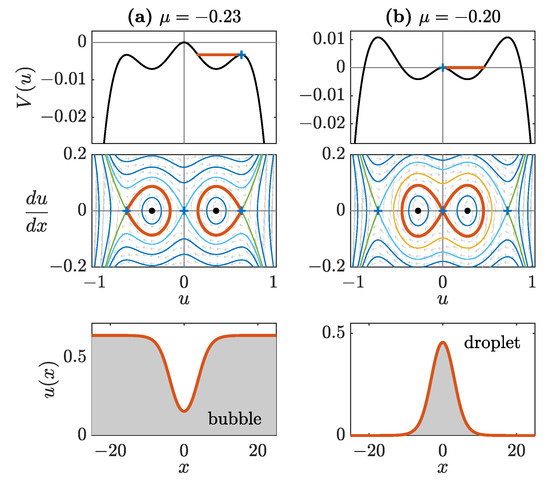 Turning to the case of , when the maximum of at is higher than that at [top panel of Figure 1a], Equation (3) produces a bubble (or its negative) homoclinic [i.e., tending asymptotically to the same steady state from the Greek “” (to tend) and “” (same)] to , see red curves in the middle and bottom panels of Figure 1a. For chemical potentials in the interval , where the maxima at are higher than the one at [top panel in Figure 1b], there exists a bright droplet (in addition to a heteroclinic dark-soliton state that has been examined elsewhere [40]; heteroclinic stems from “” and “” (different), i.e., tending asymptotically to different steady states, see the red curves in the middle and bottom panels in Figure 1b. For , the homogeneous states and collide through a subcritical pitchfork bifurcation [23] and, finally, at , the equilibrium point at becomes a local minimum of the potential. In the latter case, the situation is similar to that known for the cubic nonlinear Schrödinger (NLS) equation and it is not considered further herein. As elaborated below, the states of interest, namely bubbles and “bright” droplets, exist, respectively, for and . These chemical potential intervals will be our main focus, in addition to the separatrix value of , where kinks and antikinks exist.