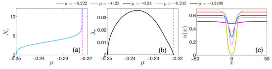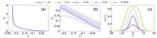 (a) Numerically obtained scaled atom number for the droplet solution as a function of the chemical potential. An increase of N occurs when tending to the transition point, below which only bubbles exist. This behavior is in accordance to the analytical prediction of Equation (9). (b) The imaginary part of the linearization eigenvalues, , is depicted with respect to . Spectral stability, where , can be inferred independently of lying within the bright droplet regime. (c) Bright droplet waveforms for different values of (see legend) deforming from a quasi-Gaussian profile as to a flat-top configuration as . These shapes and overall trend are in excellent agreement, as they should, with the exact solution of Equation (7).