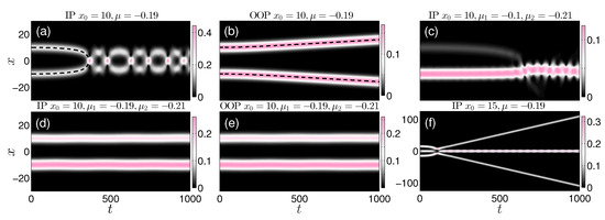 (a–e) The spatiotemporal evolution of the density of two bright droplets, initially at rest, placed symmetrically with respect to at , with different relative phases ( or ), and chemical potentials , (see legends). It is evident that (a) in-phase (IP) bright droplets bearing the same feature attraction, while (b) out-of-phase (OOP) ones repel. Dashed black lines indicate the prediction of the respective Manton’s method which is in excellent agreement with the simulations of Equation (2). In contrast, particle-imbalanced droplets either being (d) IP or (e) OOP remain nearly intact for small chemical potential differences. (c) Highly imbalanced IP droplets experience enhanced particle transfer. (f) Density dynamics of three identical IP bright droplets leading to a central, heavier and excited droplet and two lighter counter-propagating ones.