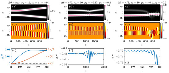 Paradigmatic droplet interactions where the droplets are initialized bearing different masses (i.e., distinct chemical potentials) are illustrated in Figure 5d–f for , and Figure 5g–i with , . In both cases, oscillation of the mass imbalance (Figure 5f,i) is accompanied by a weak attraction between the droplets (Figure 5d,g) until their collision, where both processes are enhanced. Particularly, for increasing chemical potential imbalances, a definitive collision point can be inferred, leading to a perfect mass transfer and the generation of a merger, i.e., a heavier and excited single droplet as shown in Figure 5g. However, in the case of smaller initial chemical potential imbalance, the droplets do not experience a clear collision point (i.e., they reach a minimum distance) before separating, see Figure 5d. According to the above discussion, the interaction dynamics between droplets with intrinsically involves mass exchange and strongly depends on the initial separation, relative phases and chemical potentials. It is important to mention that the particle picture that was presented above is only valid under the assumption of equal chemical potentials between the two droplets. Therefore, if one is to cast a particle picture for non-mass-balanced droplets, a different approach is necessary and, indeed, worth developing. Efforts to better understand more general droplet interactions, together with their corresponding particle picture, fall outside of the scope of the present work and will be reported elsewhere.