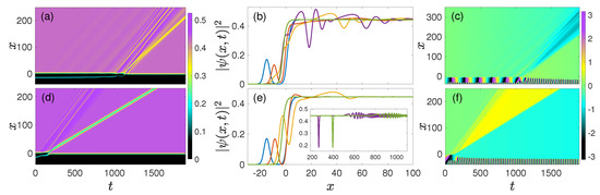 This phenomenology can be generalized for droplets with initial velocity . In this case, the collision is, as expected, accelerated, as seen from the comparison of Figure 7a,d, as well as of the corresponding snapshots in Figure 7b,e. This conclusion is also supported by monitoring the phase of the wave function, in the course of the evolution, where signatures of both the shock wave (ripples) and the gray soliton (phase jump being a fraction of ) can be distinguished. In this case, the emission of the DSW and the nucleation of the gray soliton become more conspicuous; see the inset of Figure 7e, where both entities are clearly captured. A more detailed study of collisions of traveling droplets with kinks or other effective scattering potentials is a relevant direction for studies beyond the scope of the present work. In this context, it will be relevant to consider related transmission and reflection phenomena, as was recently done in Ref. [39] for a droplet colliding with a square well.
