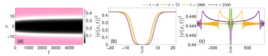 Furthermore, one can establish an upper bound of the relevant eigenvalue as , where [45]. The corresponding existence of an eigenvector such that the fraction in Equation (13) is negative confirms the existence of an associated eigenvalue pair with , which, in turn, renders the bubble generically unstable. It is interesting to contra-distinct the present case with the solitary waves vanishing at , in which case 0 is an eigenvalue of [47]. This point explains the difference between the instability of the bubbles and the stability of the droplets. An interpretation of such instability provided, e.g., in the work of Ref. [44], has to do with the metastability of the relevant configuration, in comparison with the global minimum of the energy, involving the homogeneous state with vanishing amplitude. This is also reflected in the unstable dynamics of the state to which we will return in the next section. However, the difference between that and the stable dark soliton configuration lies in the effective topological protection of the latter (due to its phase jump) that precludes its destabilization, contrary to what we will see below for the bubbles.