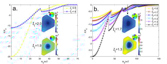 Figure 3a–d inset show some states where vortices have reached the center of the superconductor island, which can be verified by the circular diagram phase of the order parameter on the top of the island simulation. The vortex state is characterized by the total angular momentum L through , but, we can introduce an analog to the total angular momentum which is still a good quantum number. Choosing circular loops at the periphery of the center of the island, we find that the effective angular momentum , and each time that in the path the color went from red to blue a vortex is found . The superconducting order parameter , nucleated at the sample surface, traps them inside in the island hole, carrying flux where is the quantum flux. To check this ‘‘flux compression’’ model quantitatively, the self-consistent solution of the full Ginzburg–Landau (GL) equations is necessary Equation (3).
