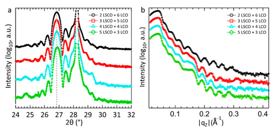 (a) X-ray diffraction (XRD), (b) X-ray Reflectivity (XRR) of AHTS. Black circles, red squares, turquoise triangles and green deltoids correspond to XRD and XRR for different superlattices with a constant period d = 8 ML, and different L/d ratios. AHTS are classified as mLSCO + nLCO, where m and n are integer numbers of ML of LSCO and LCO, correspondingly.