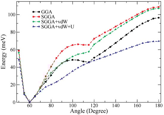 In Figure 2, the energy landscape of Cu is shown. To make this graph, we fixed several angles (from 0 to 180 degrees in steps of 5 degrees) and identified the optimal d distance, which minimizes the energy for each of them. We see that using just GGA (black curve), it predicts two minimum energy points (), representing two stable isomers, as reported in [21,22]. The minimum energy point (near ) tends to disappear when the spin-polarized calculations (red curve) and vdW dispersion forces (green curve) are introduced (here, the first effect due to spin-polarized calculations and vdW forces is observed). Finally, when the Hubbard U term is taken into account (blue curve), there is only one minimum energy point on the energy landscape of Cu, corresponding to one stable isomer for Cu, which is an equilateral triangle (). The inclusion of the term U rules out the possibility of finding the metastable isosceles triangle reported in previous DFT studies [21,22,36]. On the other hand, in Figure 2, it can be seen that the linear isomer for Cu corresponds to a maximum energy point (); therefore, the linear isomer Cu(B) in Table 1 is unstable. By analyzing the behavior of the Cu(B) isomer, we can see that the atomic relaxations could converge on structures that correspond to points of maximum energy in the energy landscape. However, the point of maximum energy seen in Figure 2 at is really a saddle point. In other words, at this point, the energy is a function of two variables E(, d). Therefore, for variations of , the behavior of the energy is as shown in Figure 2, whereas for a fixed value () and variations of the interatomic distance (d), E(, d) has a minimum at . So we can ask: Which of the structures in Table 1 are also unstable (saddle points for the energy)? Building the energy landscape for Cu, Cu, and Cu is not easy, so we must find other ways to determine the stability of copper clusters.