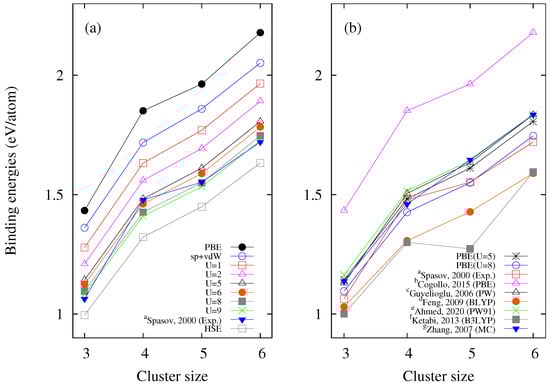 In Figure 3a, it can be seen that when the value of U increases, the values tend to approach the experimental values reported by Spasov et al. (2000) [23]. It can also be observed that the values calculated using the HSE hybrid functional are further from the experimental data than those calculated using SGGA + vdW + U. On the other hand, Table 2, Table 3 and Table 4 also show the values of the binding energies reported by other authors [17,18,19,20,21,22,23,36], and Figure 3b shows a comparison of the binding energies calculated in this work for and eV with those reported in other works. It can be seen that our results are closer to the experimental values than those previously calculated, even for eV. Therefore, we can suggest any value of U in the interval () eV as a suitable choice to work with copper atoms. These values of U are, in any case, in line with those of previous works that have used values for U between 4 and 8 eV for copper and copper oxides [8,68,69,70,71,72]. In addition, in Figure 3a, it can be seen that the values of the binding energies calculated using only spin polarization and vdW (sp-vdW) are closer to the experimental data compared to those found using only PBE. This shows the importance of including these interactions in this work.