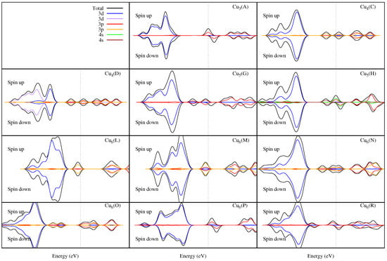 On the other hand, regardless of the value of U, we found the following property for the isomers in our study: the binding energies increase with the cluster size. The ground state of the Cu and Cu isomers exhibit a symmetry, whereas the GS for the Cu and Cu structures exhibit and symmetries, respectively. The Cu and Cu copper clusters exhibit a magnetization close to 1 a.u. due to the polarization of their atoms (see Table 7). Isomers with an even number of atoms exhibit no magnetization, but there is an interesting exception for the Cu(P) and Cu(R) isomers, which exhibit a magnetization of around 2 a.u., also due to the polarization of their atoms (see Table 9). In Figure 5, it can be seen that the isomers with magnetization do not exhibit a symmetric DOS around the Fermi level where the and orbitals of the copper atoms predominate.