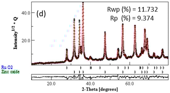 To verify the crystal structure, Rietveld refinement was performed using MAUD software to check the purity of the samples. Figure 2a–d feature the refinement of the Zn1−xRuxO samples of set A and set B for x = 0.00 and 0.04, respectively. Rietveld refinement confirmed the formation of the hexagonal wurtzite structure of the ZnO nanoparticles in both set A and set B with RuO2 as a secondary phase with a goodness of fit of ≈1.
