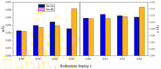 The variation in the lattice parameters, calculated using MAUD software, is represented by a comparison histogram in Figure 3 for set A and set B Zn1−xRuxO nanoparticles. The lattice parameters reduce its value as the heating temperature increases in set B, similar to the findings reported by Kayani et al. [33] while studying the effect of calcination temperature on ZnO nanoparticles. As ruthenium doping increases, the lattice parameters increase, confirming the increase in crystallite size shown in Table 1. Such trends are attributed to the increase in surface dangling bonds that tend to increase the bond length (L). Obviously, lattice parameters (a) and (c) showed an increasing tendency with the volume fraction (V) and bond length (L) with the reduction in the crystallite size as Ru doping increases, as shown in Table 1. This may be due to a change in cation–anion attraction forces as Ru3+ ions are integrated into the Zn2+ interstitial position, leading to a change in the samples’ electronegativity [34].