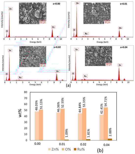 (a) EDX and SEM figures and (b) weight % of Zn, O, and Ru for Zn1−xRuxO (x = 0.00, 0.01, 0.02, and 0.04) nanoparticles in set B.