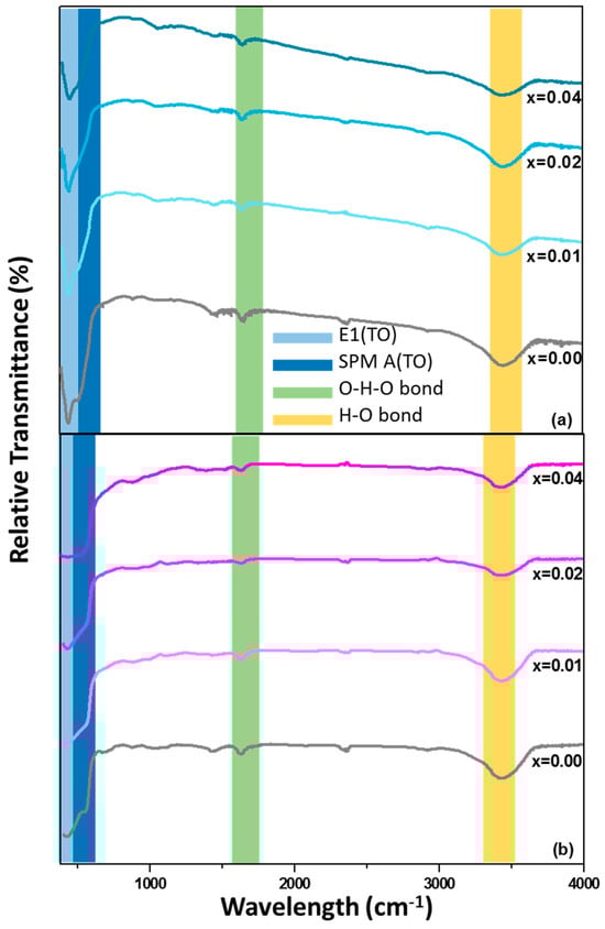 FTIR spectra of Zn1−xRuxO nanoparticles in (a) set A and (b) set B.
