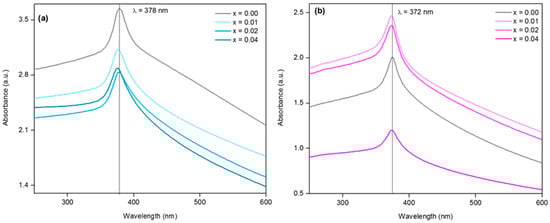 UV–vis spectra for the Zn1−xRuxO nanoparticles in (a) set A and (b) set B.