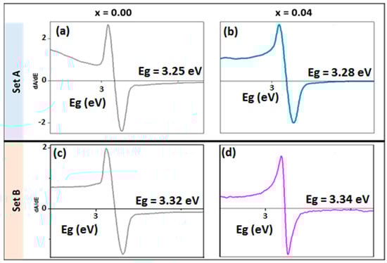For the determination of the energy gap (Eg), the first derivative of the UV–vis absorbance was used and is shown in Figure 7. (Eg) represents the intersection of dA/dE with the energy axis [51]. In both sets A and B, the energy bandgap increases as the Ru doping concentration increases. The quantum confinement effect is manifested when (Eg) increases with the decrease in particle size [52]. Comparing the changes in set A and set B, a blue shift in set B is noticed, showing that as ruthenium is doped in ZnO, oxygen vacancies may occur in the host structure, allowing electrons to be liberated towards the conduction band and charge positively [53,54].