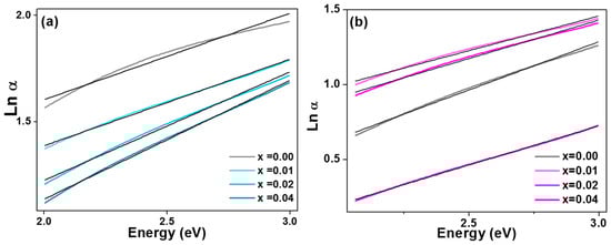where (A) and (h) are the adsorption coefficient and incident photon energy, respectively, while (Ao) is a constant. The linear fit of the plot ln(A) versus (h) shown in Figure 8 represents the value of the Urbach energy. The higher values (Eu) in set A refer to a higher magnitude of disorder that exists in the nanoparticles, which directly flow under the crystallite size variation, as reported by Ngapal et al. [56]. Figure 9 shows an inversely proportional variation between (Eg) and (Eu), as reported by Singh et al. [57]. Moreover, the highest concentration (x = 0.04) in set B showed a slight increase in the Urbach energy, confirming the secondary phase RuO2 shown in the XRD refinements and the increase in the crystal disorder.