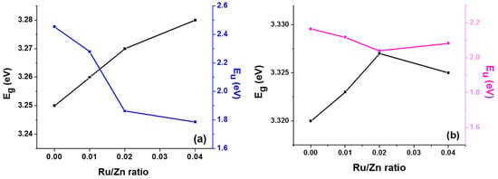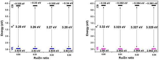 where χ and E0 are two constants related to electronegativity (5.79 eV) and free electron energy (4.5 eV) [59]. The calculated energy was found to be around −0.32 eV for ECB and around 2.93 eV for EVB, which showed a direct correlation with the UV–vis analysis. An increase in the EVB as Ru doping increases is marked in both sets; this finding may be directly related to the difference in the crystallite size, resulting in higher energy levels in this region [60].