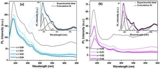 PL spectra for the Zn1xRuxO nanoparticles (a) in set A and (b) in set B; the insets show a zoom-in of the deconvolution at x = 0.01.