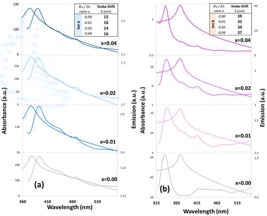Analysis of the photoluminescence spectra provides an understanding of the generation and recombination of photo-generated electrons and holes. This understanding is essential for predicting the photocatalytic activity potentials of the studied materials. Figure 11 illustrates the PL spectra for all the prepared Zn1xRuxO nanoparticles for set A and set B. The deconvoluted spectra, shown in the inset, depict the emission peaks for blue, green, and red colors for both sets at 468 nm, 527 nm, and 625 nm, respectively. The green emission at 527 nm shows a broader peak in set B with no remarkable shift. This reveals a reduction in surface defect emission, which is verified by the specific surface area results tabulated in Table 1. Set B (3.99 to 6.1 m2/g) shows a lower value than set A (5.83 to 7.61 m2/g). At 394 nm for set A, a high peak centered around the band edge emissions drops to 386 nm for set B, confirming the quantum confinement effect noted in the UV–vis analysis, leading to recombination of free excitons at a lower growth temperature [66]. This blue emission shift is also confirmed by the Stoke shift illustrated in Figure 12. The Stoke shift is the main peak difference between absorption and emission. Figure 12 demonstrates a stack graph for UV–vis absorption and PL emission versus the wavelength for both sets. Considering the effect of Ru doping, the significant change in the area under the emission curve shows increased photocatalytic efficiency due to recombination of photo-generated electrons and holes [67].